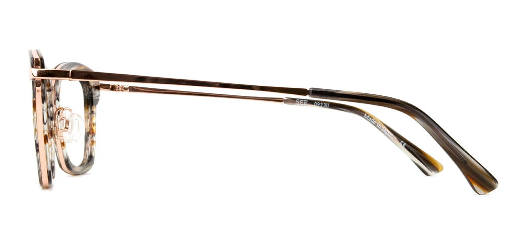 Where do we start with SEE 0923? The floating bridge? The matching acetate temple tips and frame fronts? The acetate sandwiching the stainless steel frame? The added design element of the wrapped silver to the front from the temple? Maybe the lightweight design for maximum comfort? Let’s just say this flattering style is not only gorgeous but has a lot of substance to back it up.