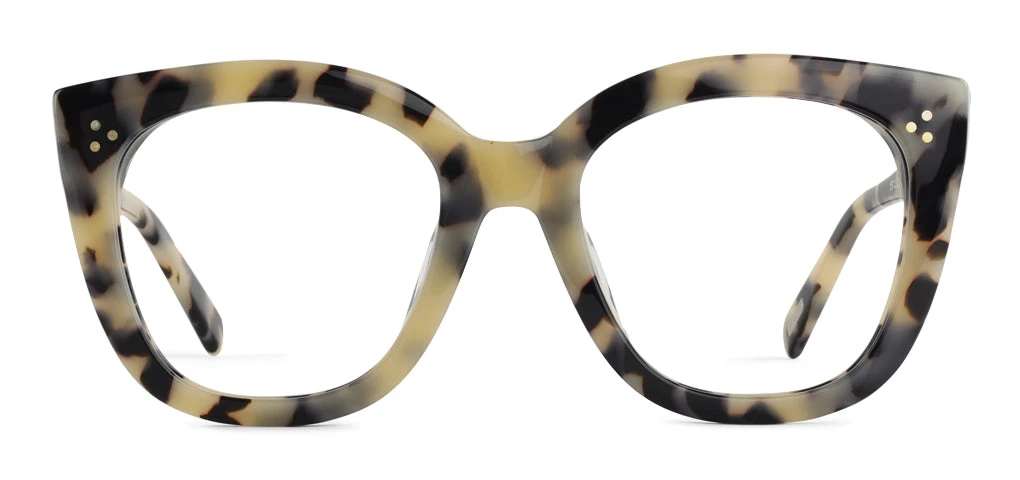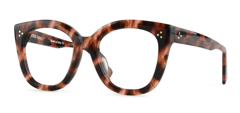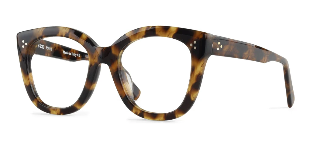SEE 55021 is an extra bold, oversized cat-eye that packs the purr-fect amount of fashion punch. The chunky acetate in stare-inducing feathered tort brings extra visual interest to this fashion-forward style.